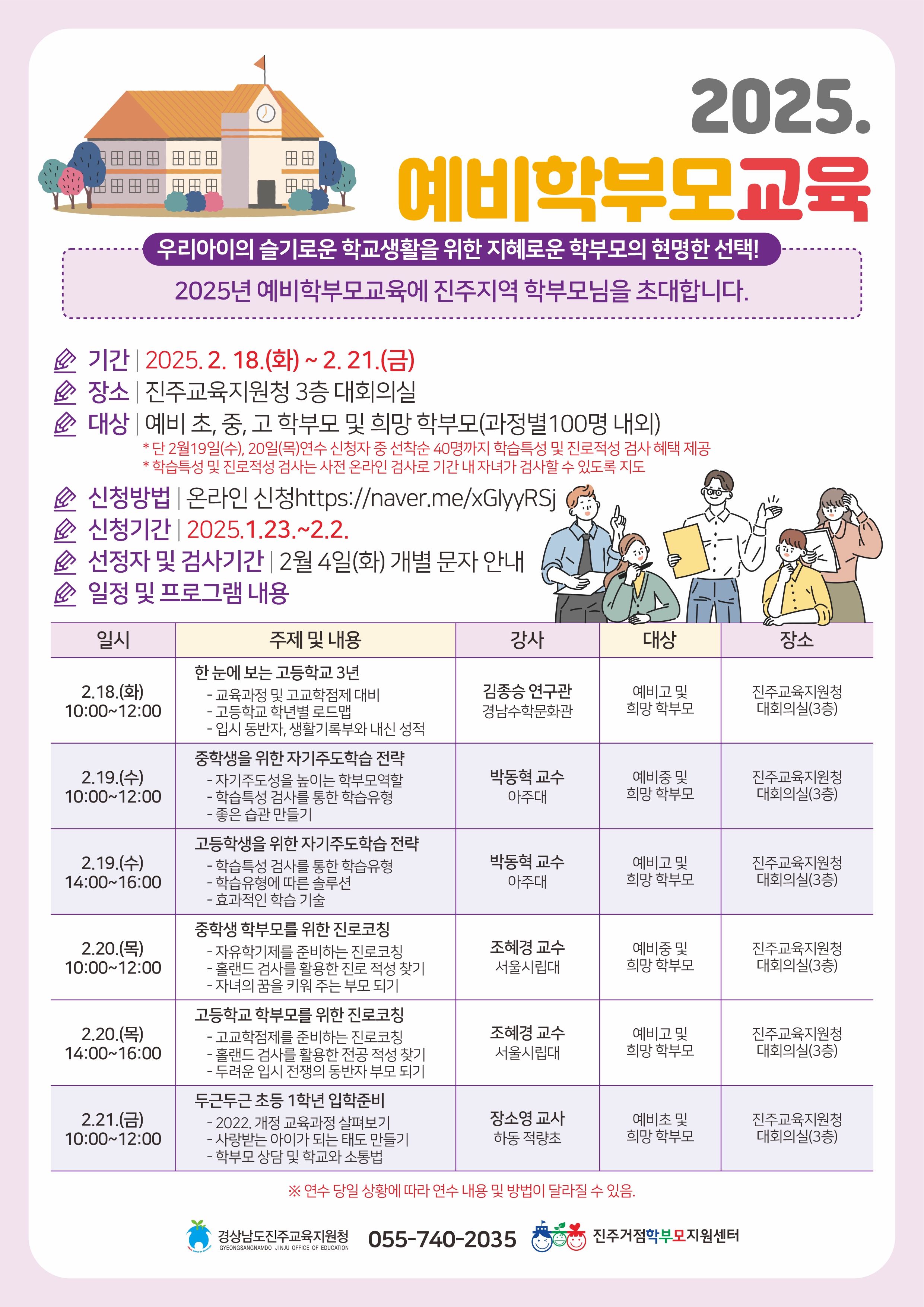 1. 기 간: 2025.2.18.(화)~2.21.(금) 2. 대 상: 진주지역 예비 초, 중, 고 학부모 및 희망 학부모
